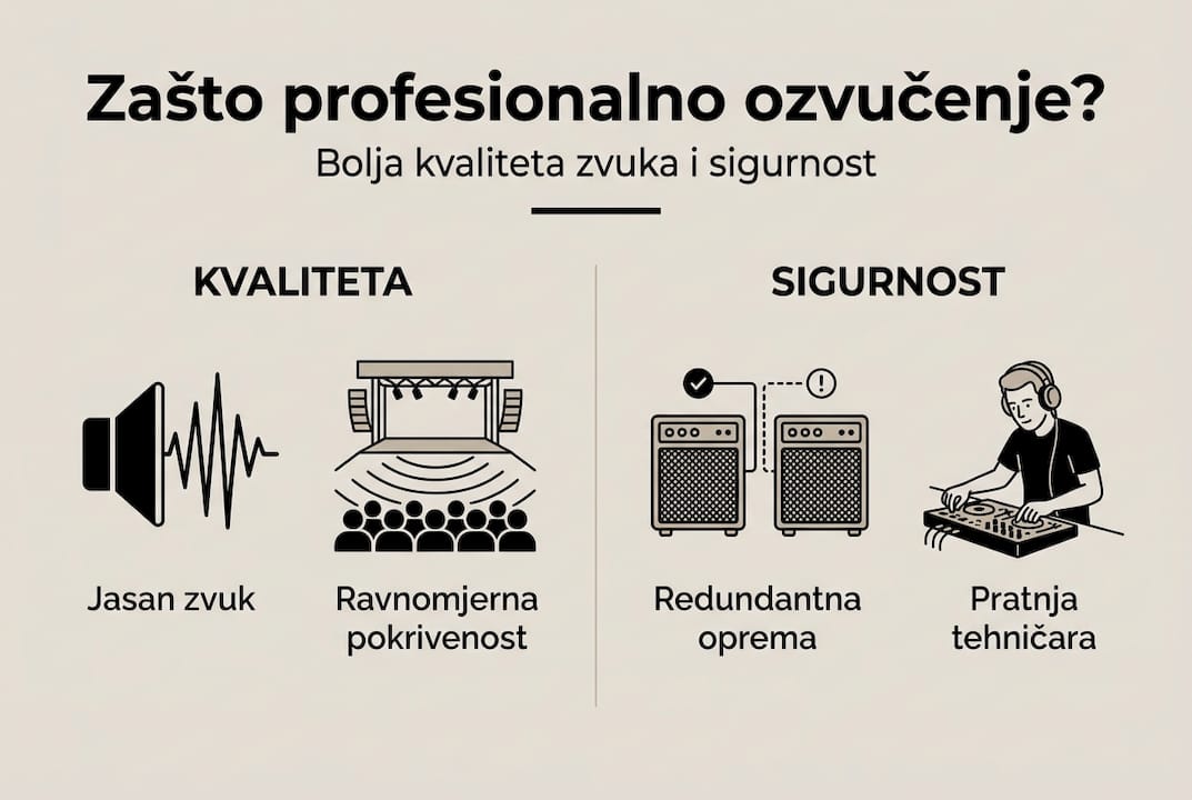 Neprofesionalna oprema nosi visok rizik tehničkih kvarova koji mogu prekinuti program i razočarati publiku. Nedovoljna pokrivenost stvara mrtve zone gdje posjetitelji ne čuju ništa ili čuju iskrivljen zvuk. Nekontrolirane razine buke mogu prekršiti zakonske limite i ugroziti sluh posjetitelja i osoblja, što može rezultirati kaznama i tužbama.